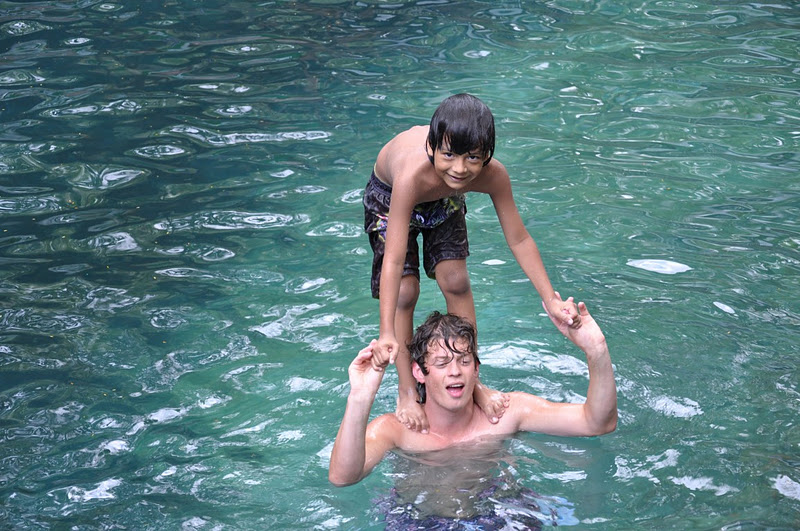 Fijn dat jullie weer lekker gewassen zijn in het zwembad. Wat is m'n vader aan het doen op die boomstam. Z'n kleinzoon heeft het van niemand vreemd.
